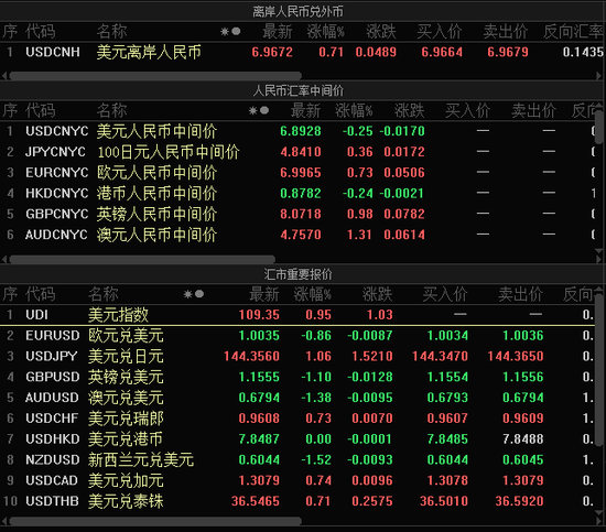 外汇市场也懵了。刚刚才开始调整的美元指数再度飙升,非美货币全线杀跌,人民币大跌近500点,日元逼近145。