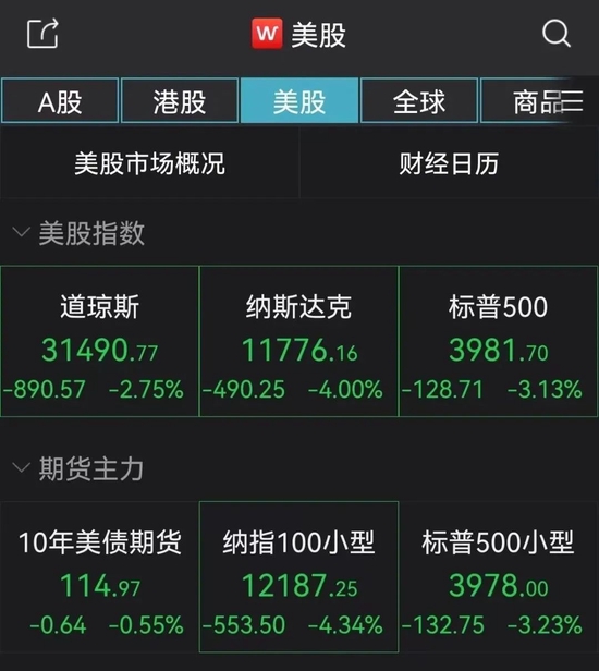 截至今晨收盘,标普500指数收跌4.32%,创2020年6月11日以来最大单日跌幅。道指收跌1276.37点,跌幅3.94%,报31104.97点,同创2020年6月来最大跌幅,点数和百分比跌幅均为年内最深。纳指收跌632.84点,跌幅5.16%,报11633.57点,创2020年3月来最大跌幅。纳斯达克100指数收跌5.54%,也创2020年以来最大跌幅,自2020年3月以来首次所有成分股均收跌。罗素2000指数收跌3.91%。投资者加速抛售科技股,芯片股齐跌,热门中概追随美股大盘下跌。 10年期美债收益率最高升近10个基点至3.46%,逼近6月中旬所创的多年高位。30年期长债收益率升6个基点至3.57%,刷新2014年来最高后转跌。对货币政策更敏感的两年期收益率升超22个基点至3.79%,刷新2007年11月来最高。三个月期短债收益率升至3.32%,创2008年1月以来最高。关键衰退指标两年/10年期美债收益率曲线倒挂幅度走扩至逾30个基点,突显市场对衰退降至的担忧。 美油收跌0.53%,报87.31美元/桶。布油收跌0.88%,报93.17美元/桶。美国政府考虑在油价降至80美元/桶时买入以补充战略石油储备,当前将放慢释放战略油储的步伐,油价闻讯跌幅大为收窄。 一篮子美元指数DXY止步四日连跌,在CPI数据发布后最高涨1.4%上逼109.90。主流加密数字货币普跌,龙头比特币在CPI数据发布后3分钟内狂跌1000美元,24小时内跌超9%,创6月以来最大跌幅。市值第二大的以太坊跌7%,失守1700美元后下逼1600美元。 |