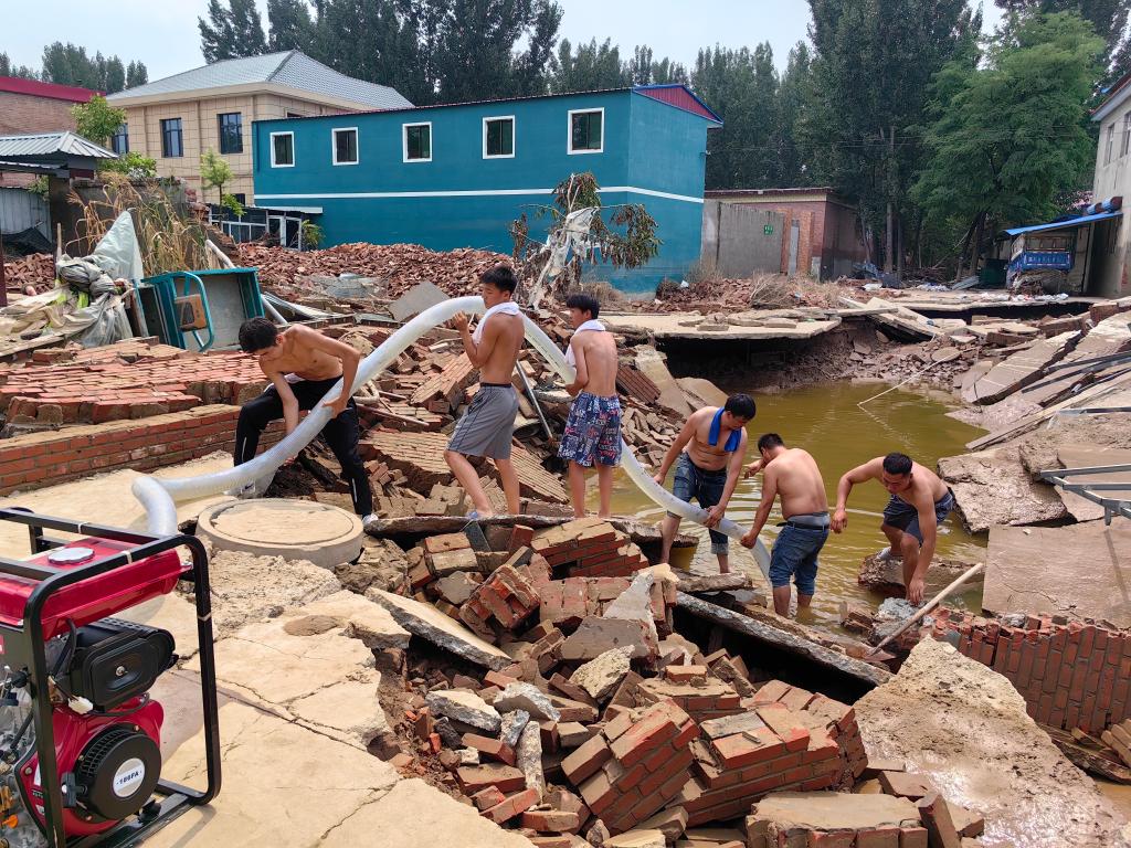 涿州市刁窝镇西茨村的青壮年志愿者正在抽水排涝。 新华社记者闫起磊 摄 李芮峰是涿州二中的准高一新生,洪水来袭时,他和家人转移到了亲戚家,8月2日就赶回村里,当起抢险救灾志愿者。 “这是我们村最后一处积水,威胁着几家村民的房屋地基,要赶紧排出去。”李芮峰说,“回村时,水位还没有完全下去,村里到处需要人手,我就和几个同村伙伴留了下来,能出一份力就出一份力。” “抽水、清淤、消杀、分发物资,脏活累活都能帮上忙,小伙子们每天都在这儿。”西茨村村委会副主任马振伟,对着大汗淋漓的年轻人竖起大拇指。 西茨村紧挨白沟河,洪水袭来,首当其冲,紧邻河渠的房屋坍塌损毁、千余亩农田绝收、水电气信中断,整个村庄一度被淹没。 洪水逐渐退去,村民们立即展开生产自救。“前天,镇里派来专业队伍对全村进行消杀,随后,我们又组织村民进行两次消杀,过两天,政府还会派专业队伍来。”在村里开诊所的马振伟十分重视灾后防疫。