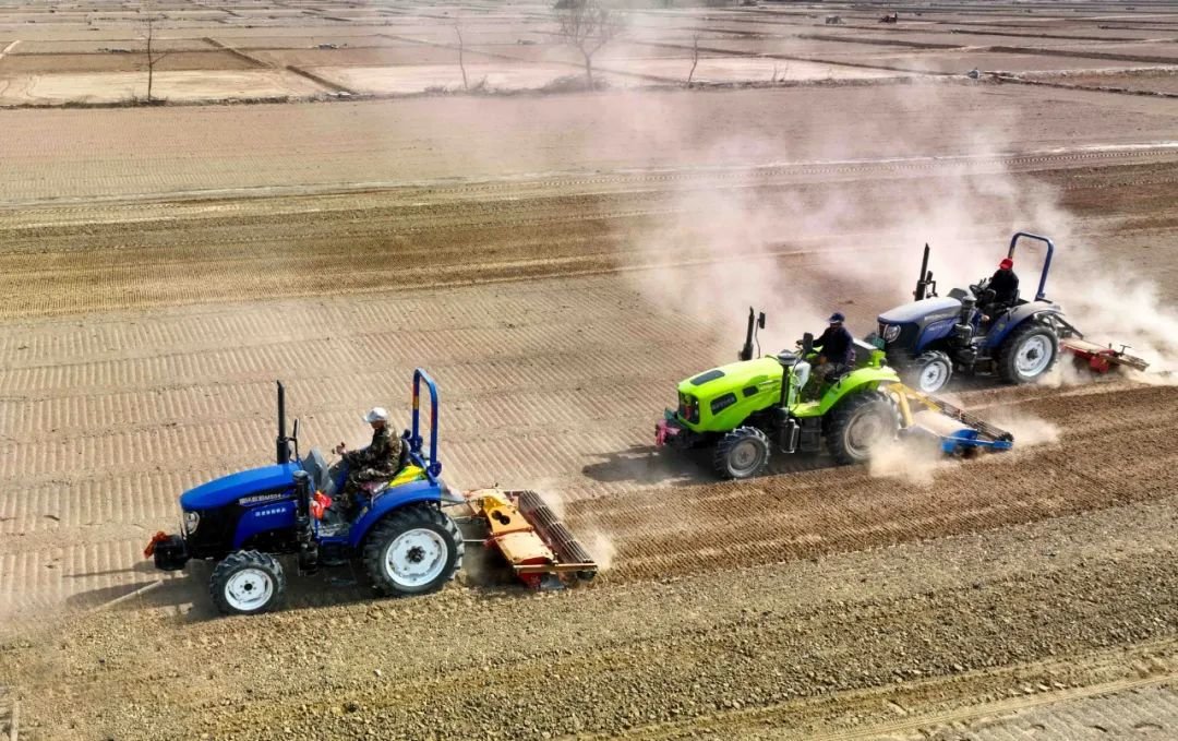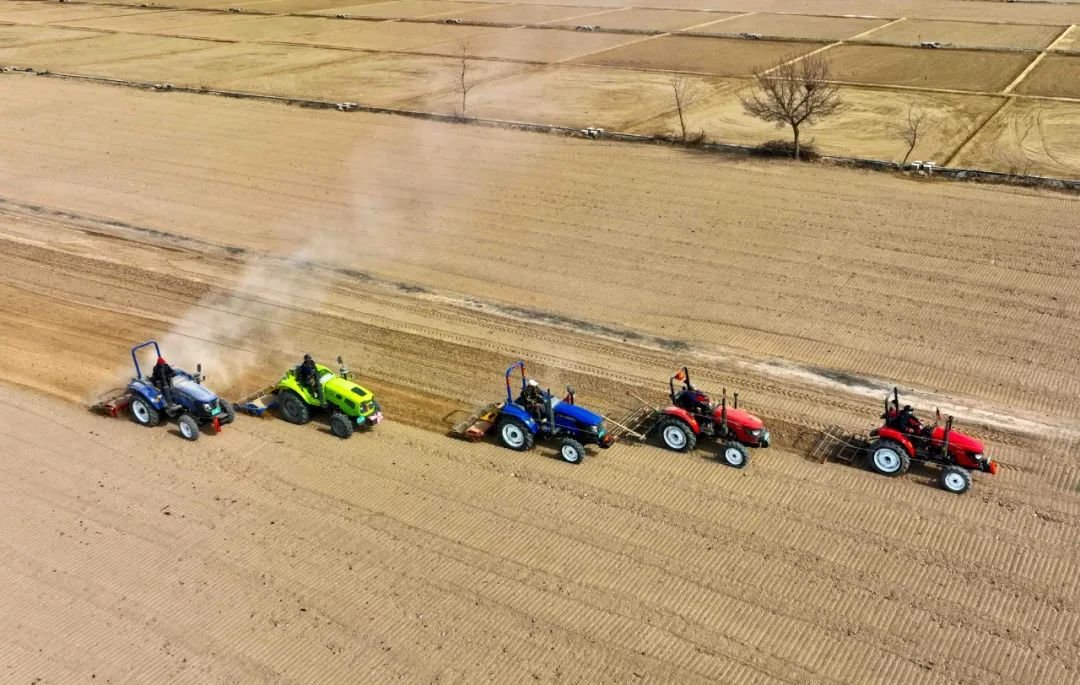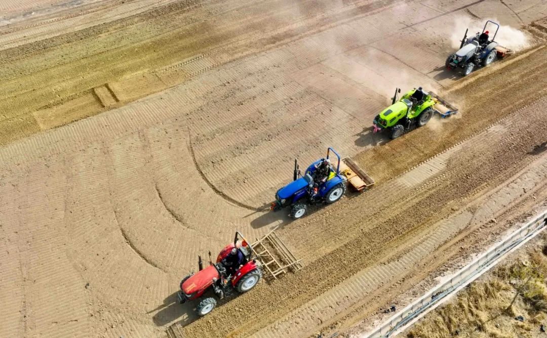 3月1日,高台县骆驼城镇新建村高标准农田里,深翻机、旋耕机、播种机来回穿梭,平整土地、施肥、播种,随着阵阵轰鸣声,春小麦种植作业一次性完成。 时下,正值春耕春播大好时节,趁着气温回升,高台县农户抢抓农时,5.24万亩春小麦播种全面展开,田间地头一派繁忙景象。
