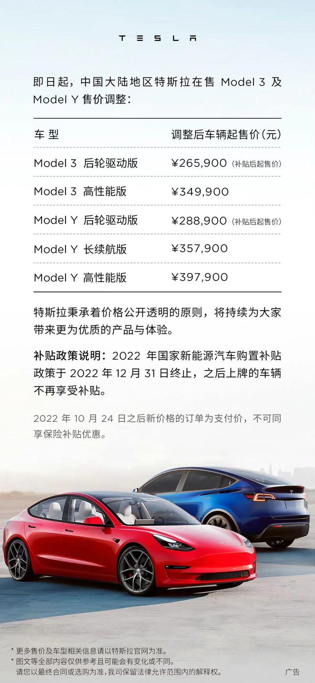 新京报贝壳财经讯 10月24日,特斯拉官微发布消息称,即日起,中国大陆地区特斯拉在售Model 3 及Model Y 售价调整,调整后Model 3车型起售价为265,900元人民币;特斯拉Model Y 车型起售价为288,900元人民币(均为补贴后起售价)。 特斯拉秉承着价格公开透明的原则,将持续为大家带来更为优质的产品与体验。