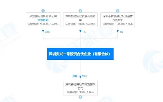 此外,通过天眼查股权穿透后,兴业国际信托有限公司(以下简称“兴业信托”)持有安兴一号98%股份,深圳恒屿实业发展有限公司(以下简称“深圳恒屿”)和深圳安居建业投资运营有限公司(以下简称“深圳安居建业”)则分别持股1%。 截图自天眼查 虽说兴业信托间接持有安和一号的绝大部分股份,但恒大在公告中只提及,接盘方为深圳市安居建业的附属公司,只字不提兴业信托。 对此,有业内人士向《华夏时报》记者指出,该地块后续发展应该是由深圳安居建业为主导,兴业信托扮演资金疏导的角色。 据了解,深圳安居建业由深圳市人才安居集团有限公司、深圳市特区建工集团有限公司、深业集团有限公司及万科企业股份有限公司共同持股40%、20%、20%、20%。 此外,值得一提的是,就在恒大在深圳湾总部基地拿地的2017年,其正式将总部从广州市搬迁至深圳。公开资料显示,2017年6月1日,恒大地产集团有限公司的注册地已更改为深圳市南山区海德三道126号卓越后海金融中心3901房,同时,注册资本由28.78亿元变为33.83亿元。 但在2021年出现债务危机后,恒大又将总部的多个部门迁回了广州恒大中心。2022年1月10日,有市场消息称恒大集团已从深圳总部大楼搬离,彼时,恒大官方回应称,为节约成本,公司于2021年12月办理了卓越后海中心退租手续,搬迁至深圳自有物业办公。目前,恒大集团官网仍显示其总部所在地位于深圳市南山区海德三道126号。