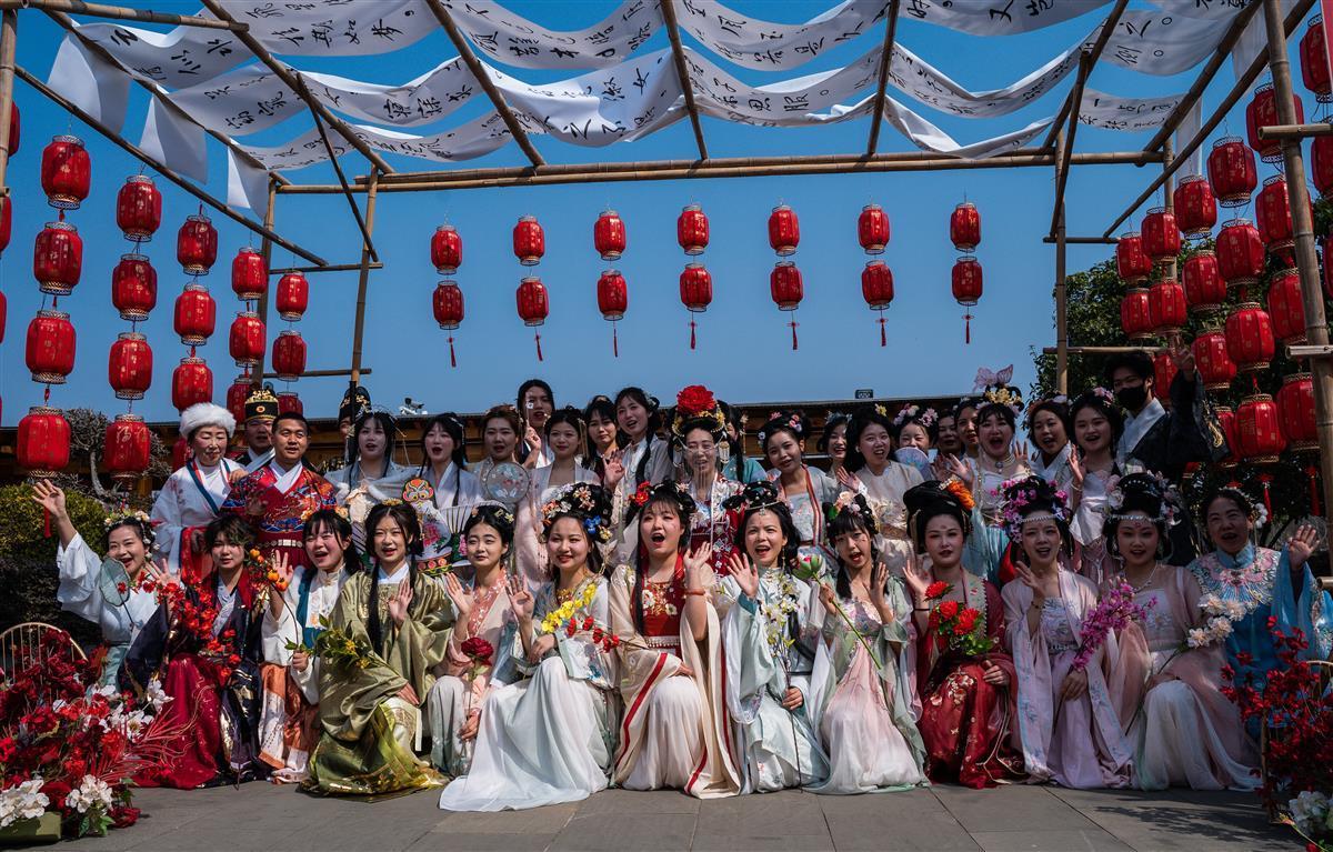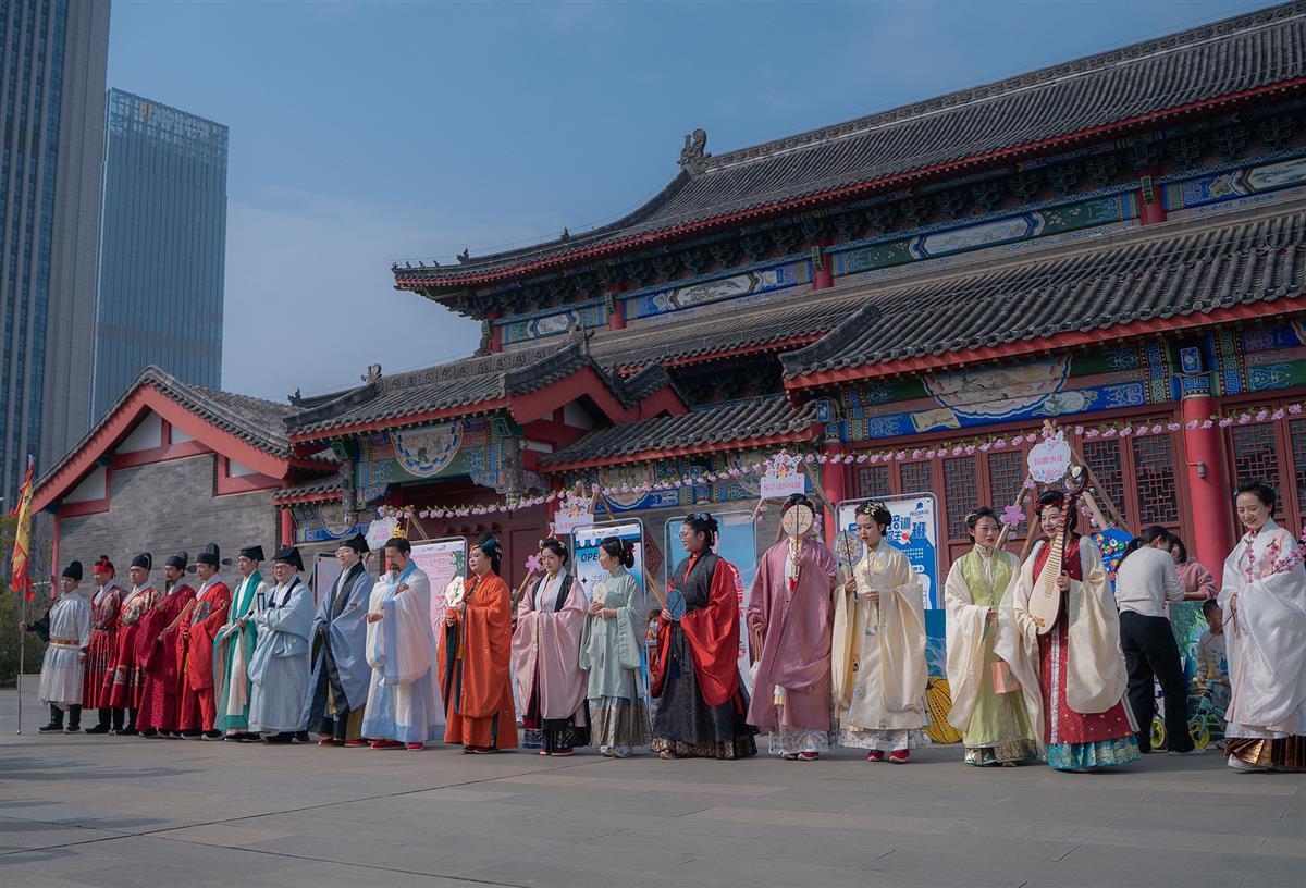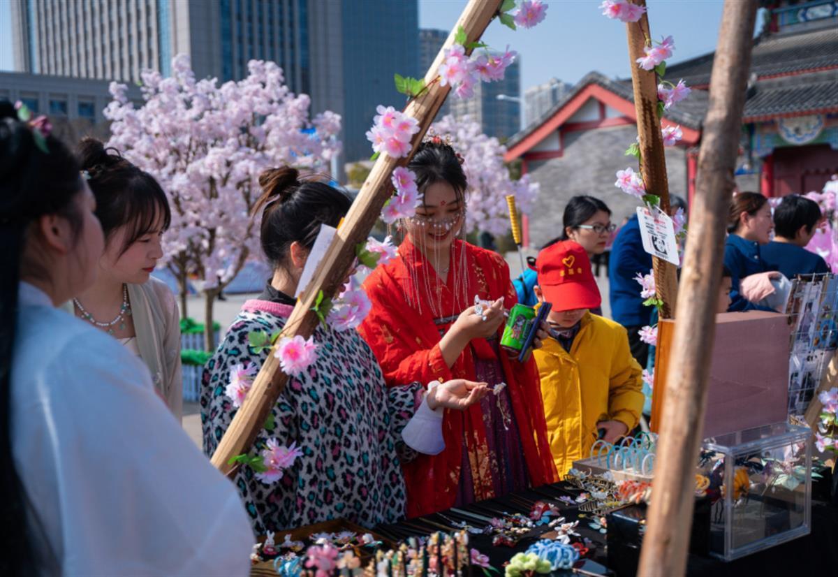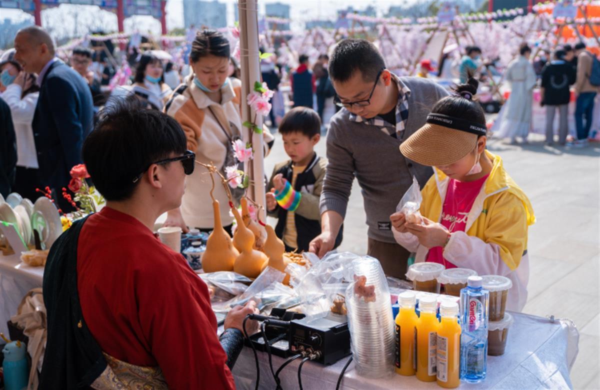 阳春三月,百花正盛。花朝节,是纪念百花诞生的日子,相传花神掌管世间万物生长,因此每年开春之初,人们都会用各种活动祭祀花神,以求一年好光景。 活动现场,不仅有琳琅满目的非遗文创市集、后备箱市集、巾帼农庄市集可逛,还有传统工艺、香飘四溢的美食小吃可品;既有传统雅趣的投壶体验、非遗研学体验,轻松欢乐的联谊活动和月老办事处等可玩,又有华美典雅的汉服巡游、翩然若仙的花神表演、好戏连台的戏曲表演、“看见她的美好”春天朗诵音乐会等精彩活动可赏。活动现场,如梦如幻的樱花连廊、灯笼阵吸引了不少游客拍照留念,一些年轻游客还特意穿上传统汉服来此打卡。